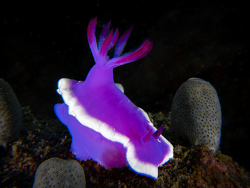 Der kleine rosa Seeigel ist gegenüber den üblichen Seeigeln in der Meerwasseraquaristik mit seinen 2cm Durchmesser ein echter Winzling. Er ist ein Dekorateur Seeigel, hat sich sofort ein leeres Napfschneckenhaus als Mütze aufgesetzt und sich rundherum mit kleinen Steinchen dekoriert. Er ist unter seiner Tarnung im Becken kaum zu entdecken. Nur ein paar rosa Stacheln sind manchmal unter der Dekoration zu sehen. Sein Bewegungsradius ist bis jetzt überschaubar. Er bewegt sich hauptsächlich am Sandboden, ab und zu in nur geringer Höhe an der Scheibe und auch nicht all zu weit vom Platz entfernt, an den ich ihn erstmalig eingesetzt hatte. Pink Lady ist empfehlenswert für Nano Aquarien; für größere Becken (ohne Fressfeinde) auch möglich, aber dann in größerer Zahl. Ich hatte ihn gekauft, um schwer zugängliche Algenstellen zu beweiden, an die mein Pfaffenhut aufgrund seiner Größe nicht kommt. Einen nennenswerten Einsatz als Algenfresser konnte ich bisher nicht feststellen. Salamcis sind eher Allesfresser.