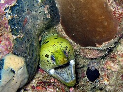 Gymnothorax fimbriatus is a medium-sized moray. Its serpentine in shape body has a white cream to light brown background color dotted with numerous black spots which latter vary in size and shape depending on the individual and maturity.