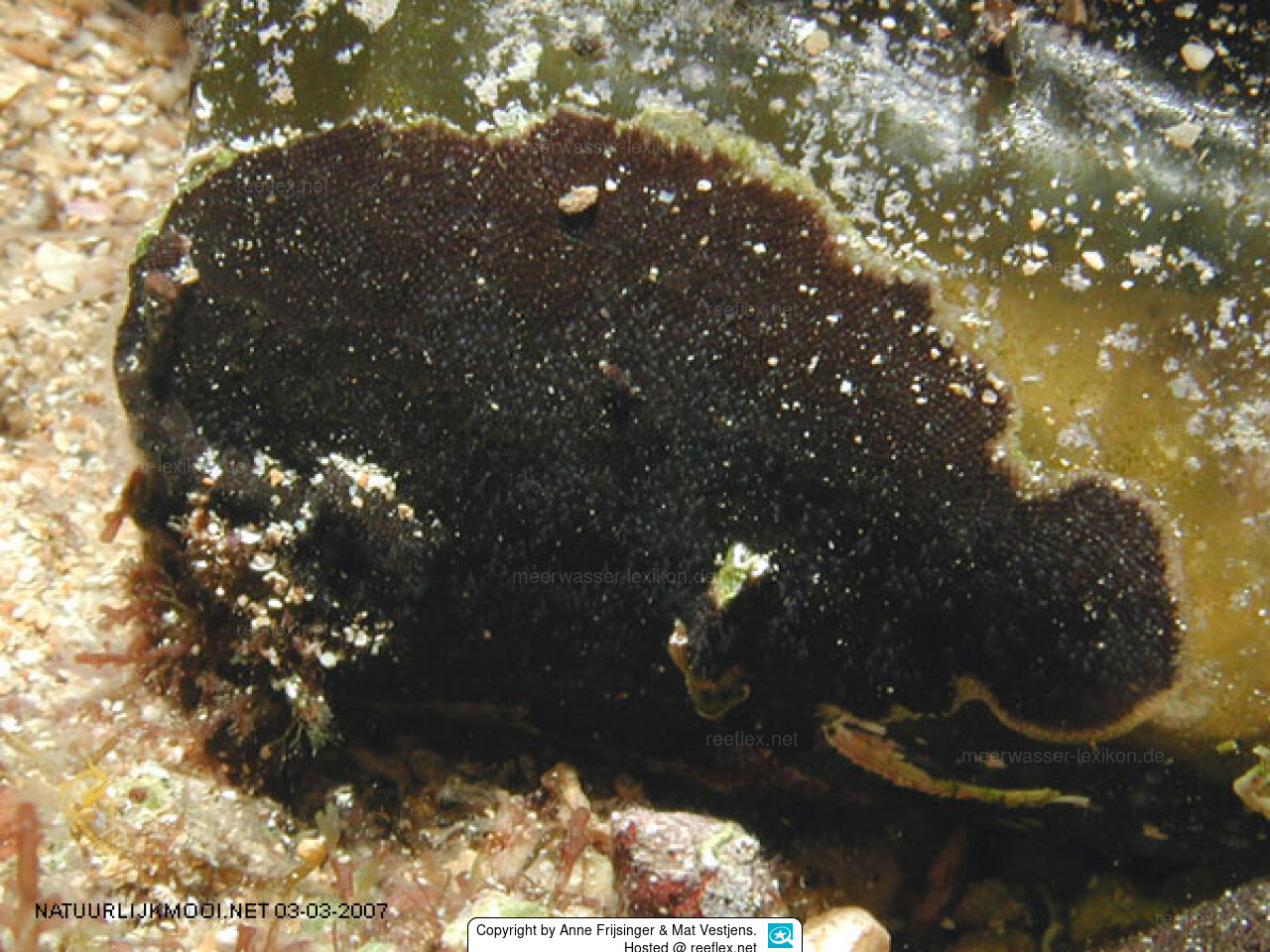 Reptadeonella violacea is an encrusting bryozoan, found in warm temperate waters. Colonies form broad, often extensive, encrustations which are deep purple when living with a paler periphery of developing autozooids. Autozooids are hexagonal, pear-shaped or lozenge shape. They are flat or slightly concave with a more or less marked central depression. Autozooid size is typically 0.5-0.68 by 0.2-0.34 mm.